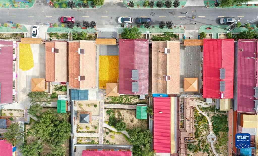 2021年10月3日拍摄的宁夏吴忠市红寺堡区柳泉乡永新村的“共享庭院”(无人机照片)。新华社记者 冯开华 摄